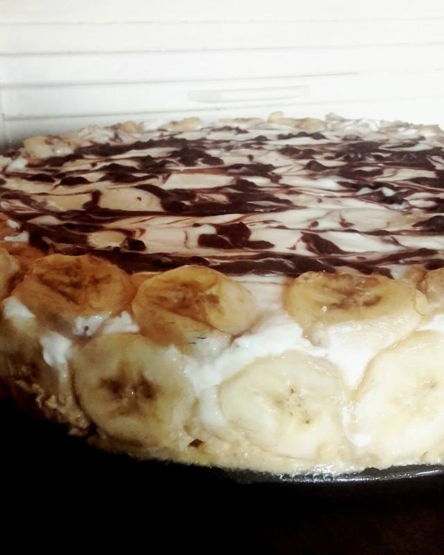 Umočila sam običan keks u mleko i počela da ga ređam na dno kalupa. Zatim sam preko toga iseckala bananu i stavila bazu od plazma torte (plazma keks, malo maslaca i čaša soka od breskve). Poređala sam u krug kalupa kolutiće banana i na to prelila pudingom od vanile ... kad se malo prohladio puding poređala sam opet sloj banana i prelila filom (pola mere) od njam njam cake-a. Preko toga sam sipala topljenu čokoladu i čačkalicom išarala paralelne linije po torti uzduž i popreko.
